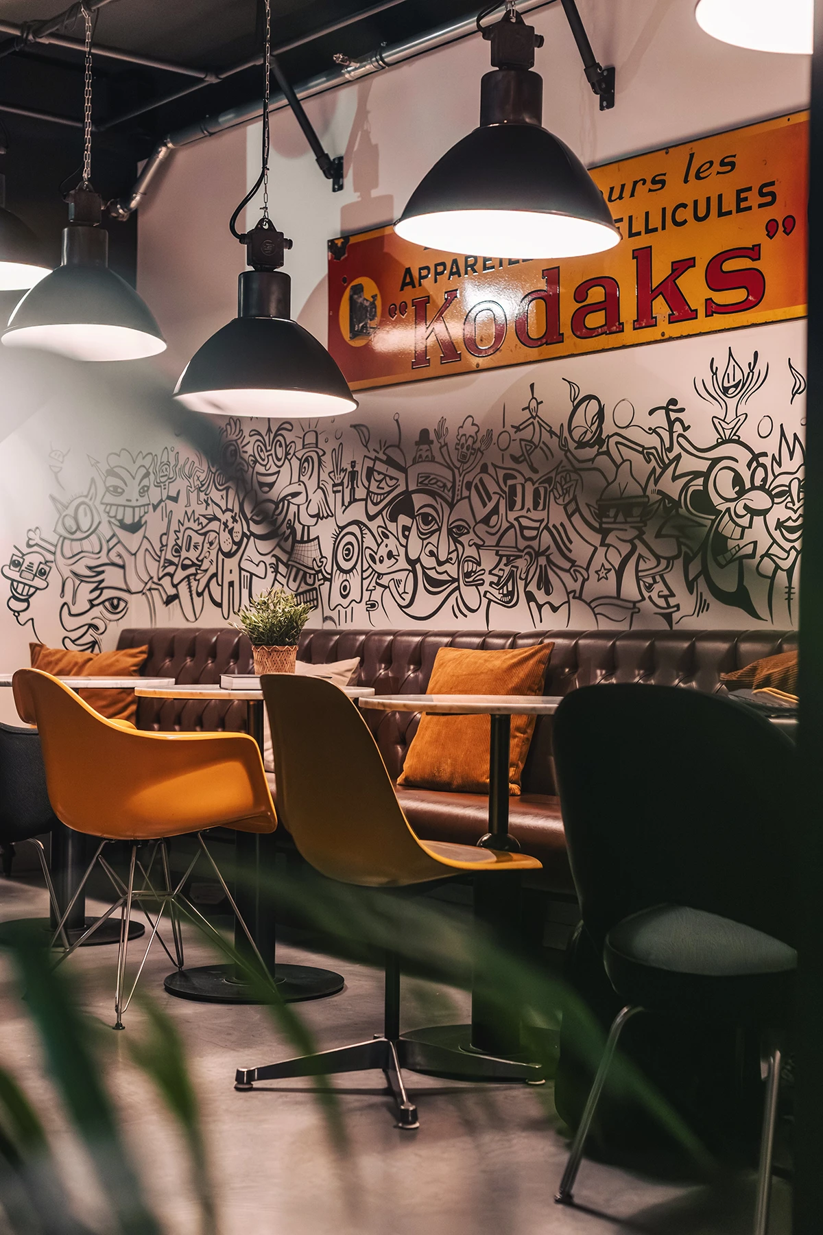 Zoom Hotel stands out thanks to a strong concept built around photography. Every room is decorated with a unique Brussels print signed by a Belgian artist, while the shared spaces are dotted with vintage cameras, image walls, prints and graphic nods to visual culture.
